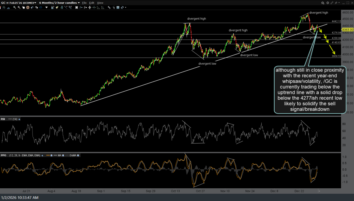 Although still in close proximity with the recent year-end whipsaw/volatility, /GC is currently trading below the uptrend line with a solid drop below the 4277ish recent low likely to solidify the sell signal/breakdown. 120-minute chart below.