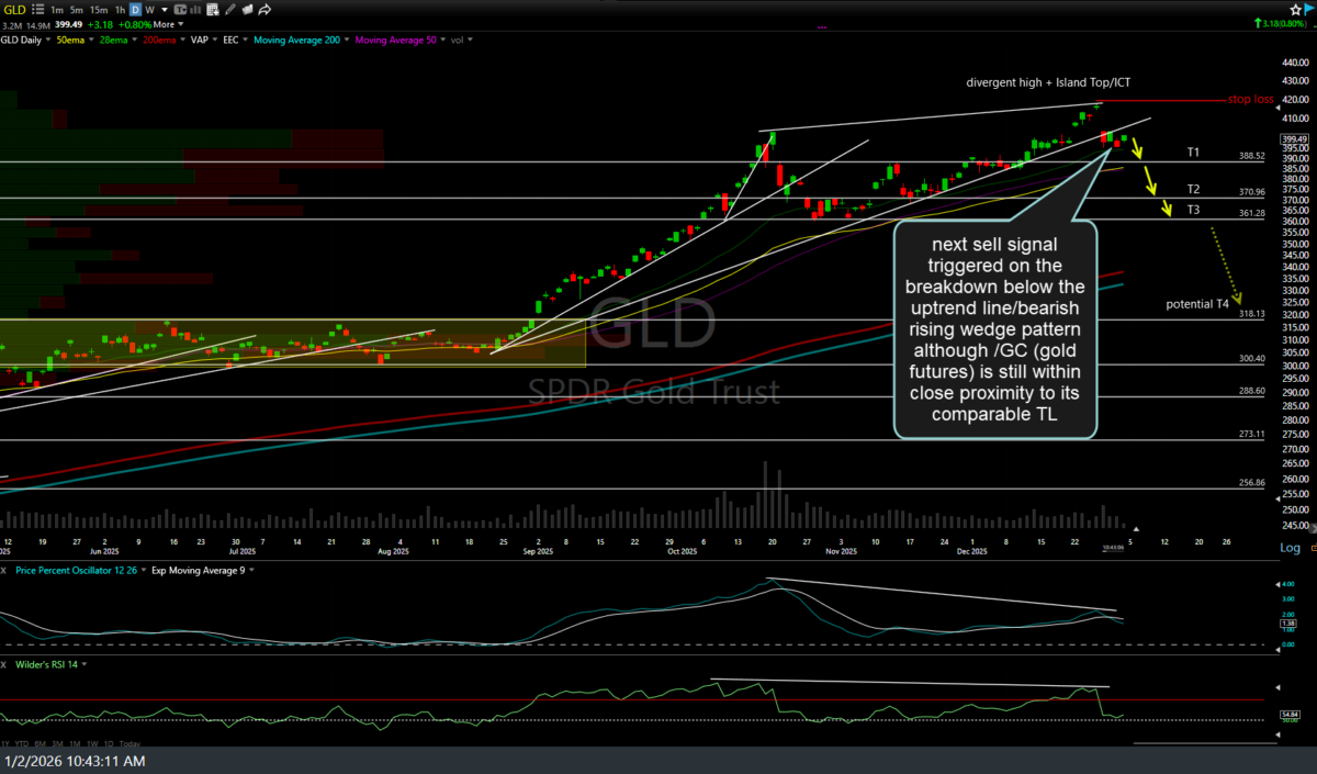 The next sell signal on GLD (gold ETF or /GC, /MGC gold futures) has been triggered on the breakdown below the uptrend line/bearish rising wedge pattern, although /GC (gold futures) is still within close proximity to its comparable trendline. As such, one might opt to only add another fractional lot here while waiting for a solid break below Wednesday’s low of around 4277 in /GC to be taken out. Daily chart below.