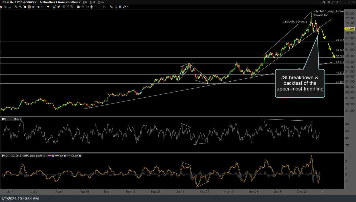 /SI (silver futures) 120-minute chart below showing the recent breakdown & backtest of the upper-most trendline.