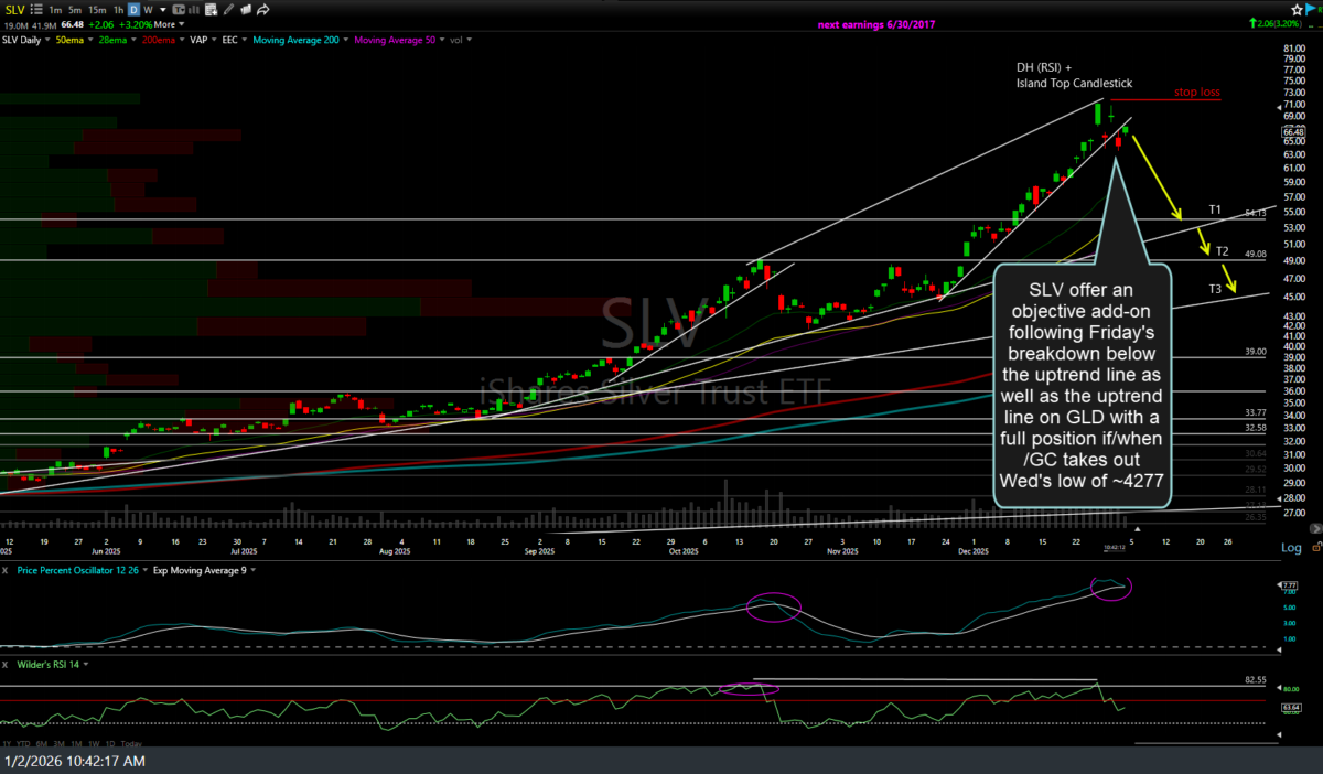 The SLV (silver ETF or /SI, /QI silver futures) swing trade that was also entered with a starter short position last week offers an objective add-on following Friday’s breakdown below the uptrend line as well as the uptrend line on GLD, with a full position if/when /GC takes out Wed’s low of ~4277. Daily chart below.