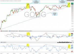 whether or not my theory holds water can be debated but as i’ve stated here before, wedge overthrow patterns, on both bullish rising as well as bearish falling wedges, have been some of my most lucrative and high probability trades over the years. as highlighted in this chart, that is certainly what happened with GOOG leading up to it’s 2007 peak, just before that nearly 70% plunge in the stock. only time will tell whether or not we are in the early stages of a similar pattern but so far, it sure appears that way. the first step will be to see GOOG make a solid weekly close back within this rising wedge pattern. keep in mind that this would also confirm a very powerful bull trap as it would mean that GOOG has closed back below the recent breakout to new all-time highs. the next, and final, confirmed sell signal would come on a downside break below the current rising wedge pattern, the bottom of which, is also the primary uptrend line from the GOOG’s IPO date back in august 2004, another very bearish level if broken.