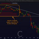 as a continuation to my review of the key financial stocks tonight, here’s the daily charts of GS and C highlighting the massive overhead supply (i.e.-resistance) they now face. whether these stocks turn down soon or not, i’m willing to bet that the next 20-30% move from above these levels will be a whole lot more difficult than the last 20-30%. if i were a buy-and-hold investor tucking away a bunch of bank stocks, at the very least i would consider selling covered calls going forward.