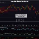 actually, IAG hit T1 (the only target i had posted) for a 9% gain from entry on monday. i covered that in the trade ideas video update on monday evening but just wanted to point that out since the trade will now be consider completed. i can make a very bearish case for this stock as well as so many of the other gold stocks (from a technical basis as i know the gold bugs are going insane by harping on the buy-of-the-century from a fundamental perspective). again, although i can see the possibility for a lot more downside on this sector, most of my gold shorts have recently hit my final targets and i am not suggesting that one should be shorting here. i might do a video overview of the technicals on some of the gold stocks soon as i know there is a very large interest in that sector. here’s the string of IAG charts as posted here, first two were 2-day charts and the last one (screenshot from the video) was from monday. i should mention that IAG has since broken that support level and continues to fall so be careful trying to pick a bottom on this sector.