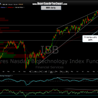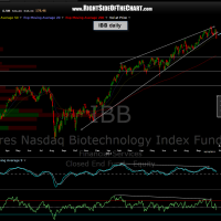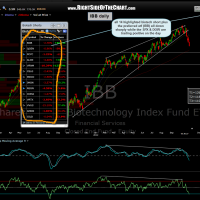 Of course, how far any bounce goes, assume that IBB does bounce, will depend largely on the broad markets. The $SPX has hit the 1365 support level that I discussed in the video last night as well as the QQQ hitting T2 (4 hour chart) just before the close yesterday and now trading above it. Let’s see if the markets can hold these levels and put in a bounce or if they will only prove to be a temporary speed bump en route to the lower targets. IBB daily charts in order as posted below: