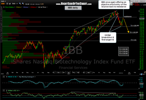 The IBB short trade is once again offering an objective entry here on the bounce back to resistance following the recent tag of the first price target. Those targeting T2 or T3 might consider a stop over the 141.50 area (a 4:1 or 6.75:1 R/R) while those targeting one more drop to T1 should consider a tighter stop, somewhat above the 138.80 resistance level shown on this updated daily chart.
