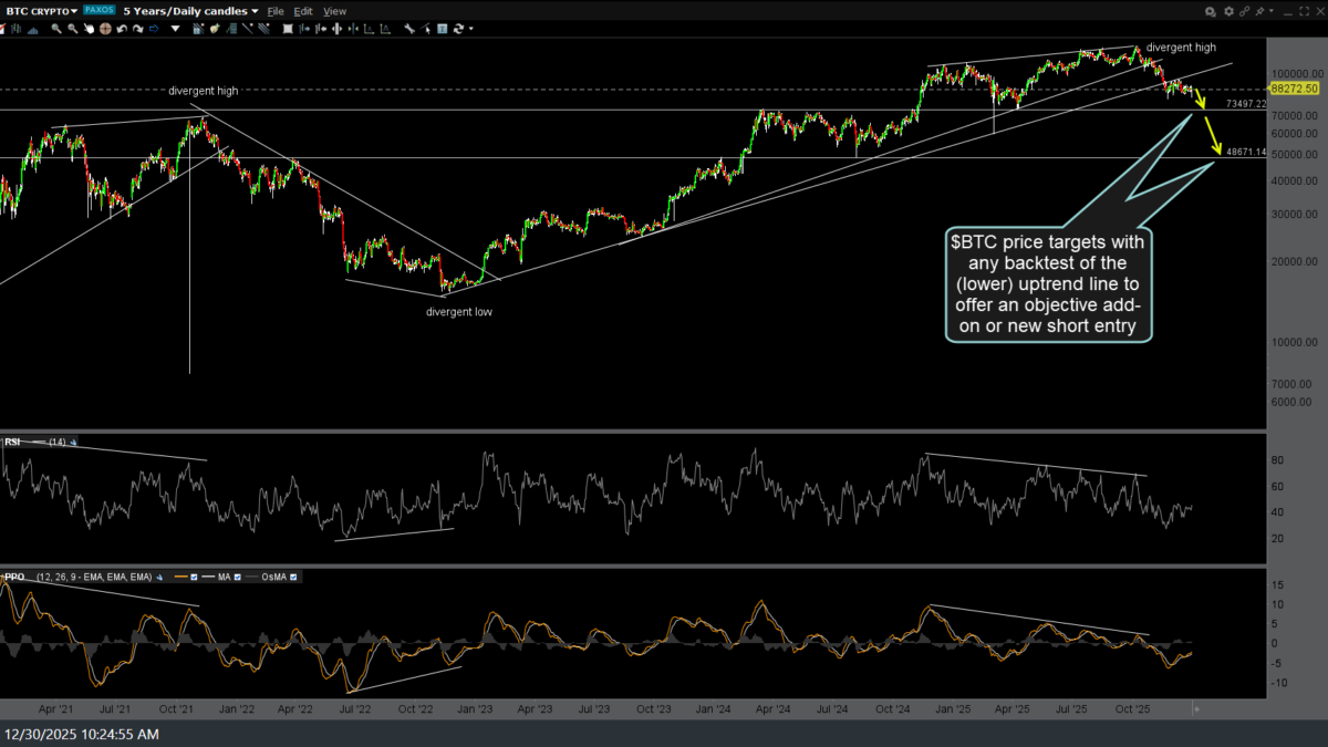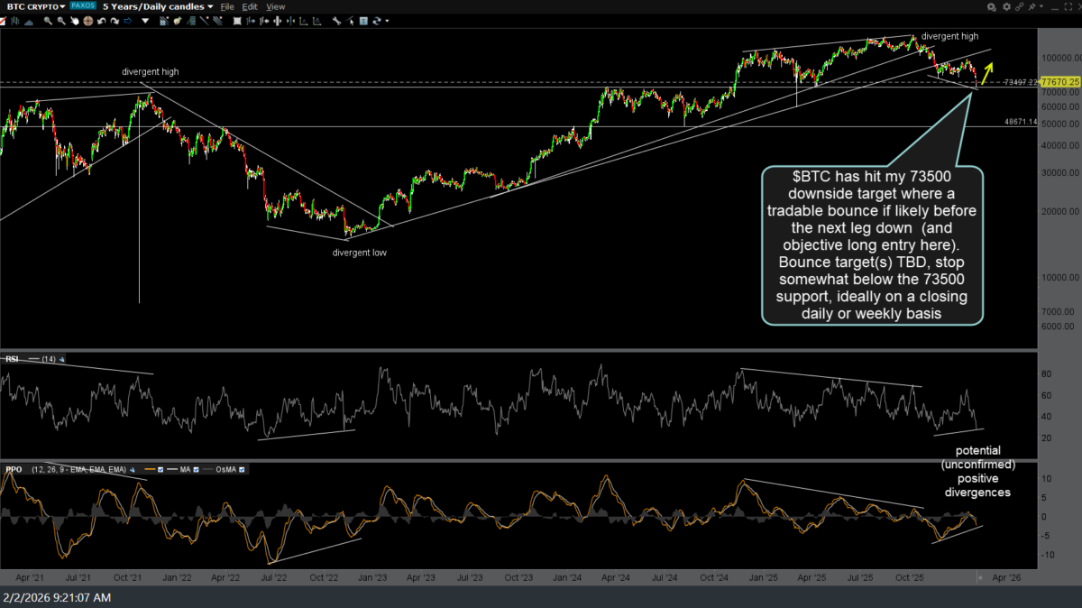 $BTC (Bitcoin) has hit my 73,500 downside target where a tradable bounce if likely before the next leg down (and objective long entry here). Bounce target(s) TBD, stop somewhat below the 73,500 support, ideally on a closing daily or weekly basis. Previous (Dec 3oth) & updated daily charts below.