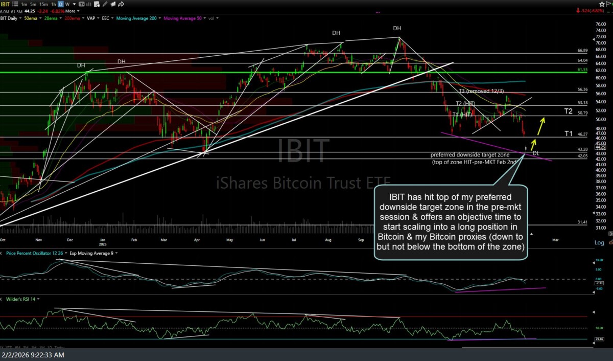 Likewise, IBIT(Bitcoin ETF) has also hit the top of my preferred downside target zone in the pre-market sessionin the pre-market session & offers an objective time to start scaling into a long position in Bitcoin & my Bitcoin proxies (down to but not below the bottom of the zone). The initial targets shown on the daily chart below although I may revise and/or add additional targets going forward. Stops commensurate with one’s average entry price and preferred price targets.