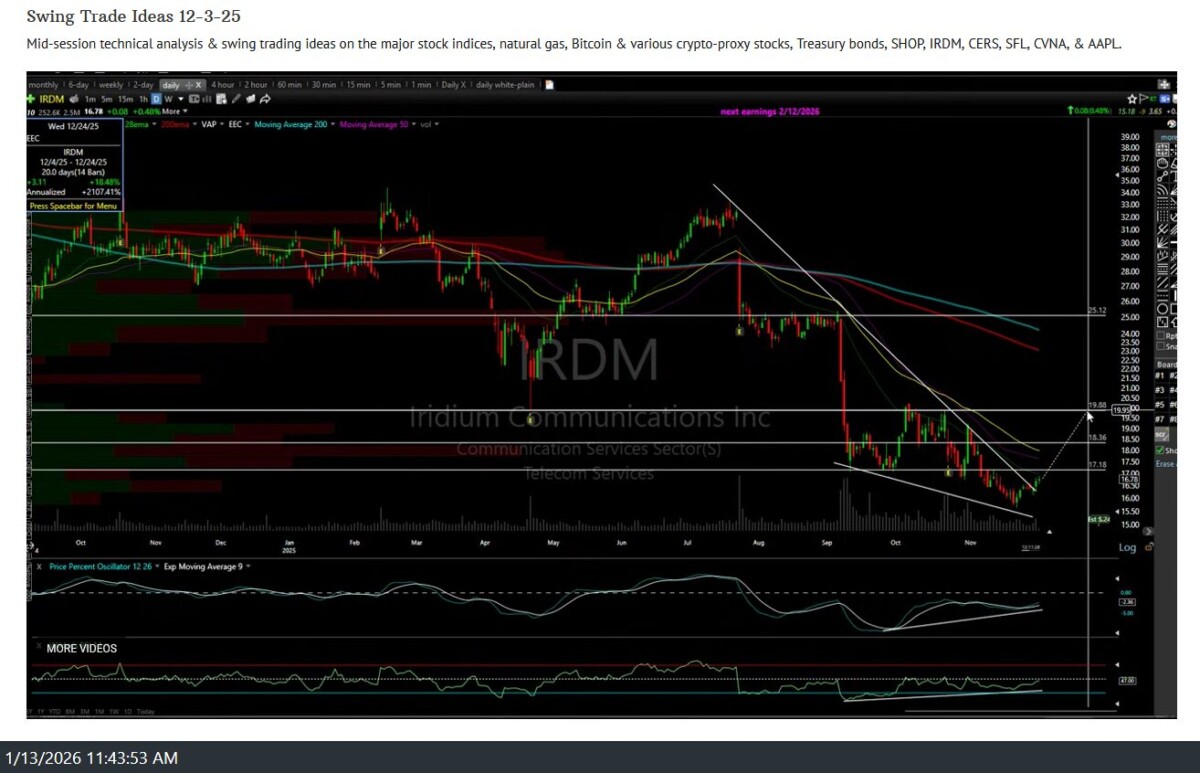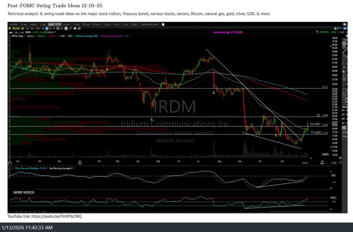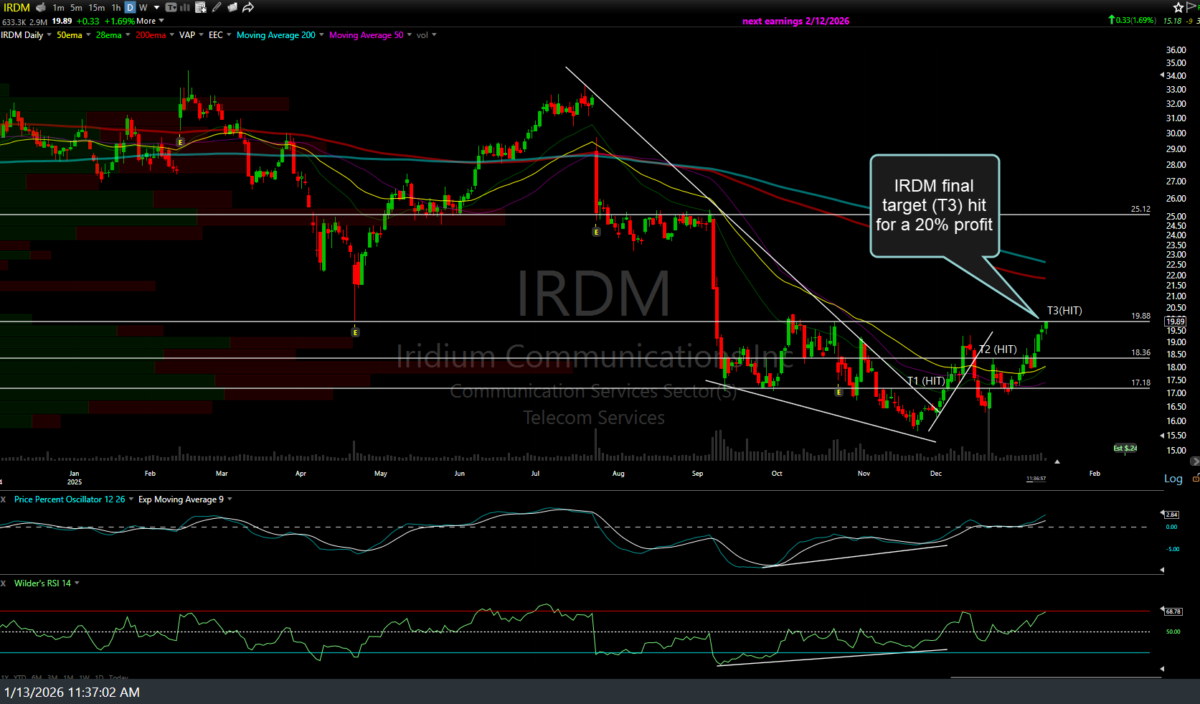 The IRDM (Iridium Communications) swing trade has just hit the third & final price target (T3) for a 20% profit, where a reaction is likely. Consider booking profits or raising stops, if holding out for additional gains. Previous (video screenshots from Dec 3rd (entry), 9th, & 1oth (T2 hit), and updated daily chart below.