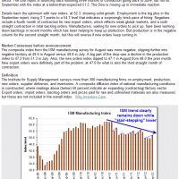 finally, as noted on the first chart below, today’s 51.5 reading, there seems to be a fairly clear pattern of “stair-stepping” lower within the current downtrend. in other words,while the overall trend on the ISM has been unmistakably lower since early 2011, the month-to-month data sets tend to ratchet up for 2 to 4 months and then suddenly drop lower than the preceding low (a new lower low). it seems that today’s above expectation “beat”, which was met with gleeful exuberance from the bulls (and/or flightly bears covering their shorts, as evidenced from the strong surge of buying following the release), is very much inline with that pattern which has been in place for the last year and a half.