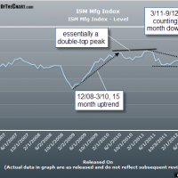 this week’s economic calendar contains quite a few potentially market moving releases. as anyone watching the markets this morning noted, prices jumped sharply at 10:00 ET immediately following the release of the ISM manufacturing index report, which came in above expectations. i won’t try to spin a bullish ISM beat as bearish although i do want to reiterate that traders should not read too much any one single data point, as week-to-week and month-to-month economic data releases tend to fluctuate rather sharply. i highly recommend focusing on the overall trend of the economic data and not putting too much stock into any single data point. just like charting stocks and stock market indices, it helps to identify and monitor trends on various time frames, particularly the short-term, intermediate-term and long-term trends. trend identification, like many other aspects of both technical and fundamental analysis can be highly subjective, hence the reason for the invariable difference of opinions between bulls and bears. when i look at the ISM manufacturing index chart, here’s what i see: