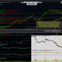 As a follow-up to the previous post mentioning some of the short trades still offering objective entries, keep in mind that one should never blindly buy or short a stock without referencing the chart first. When glancing at the charts just before I made that post, I noticed that several of those short trades were sitting right at or just above support, such as a former target that was hit before the stock bounced or in the case of the TZA/IWM trade, IWM was right at the 91.00 support level at which I had expected a bounce as diagrammed on the previous 60 minute chart posted Monday (first one below). Although I still expect that bounce to be limited in scope and duration, it would not make sense to add to a short position on the first approach of support from above. At this point, it would make sense to short the bounce or wait until that level clearly gives way before adding to an existing TZA position or establishing a new one. Previous & updated 60 minute IWM charts below.