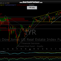 the IYR active short trade has set up in what appears to be a bearish pennant or flag type pattern. i could have drawn this one either way but show it as a bearish pennant on the updated chart (last one) below. if so, prices are starting to break below the bottom of the pattern and the projected measurement would bring prices well below T1. i have also added a level of minor but notable support (dotted line) on this chart that is just below this continuation pattern and we still have T1 support (first target) just below that. however, i currently favor at least T2 on this trade.