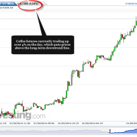 Long-term traders and investors might prefer to wait for a solid weekly close above the downtrend line while more active or typical swing traders might consider an entry on JO or coffee futures here on today’s breakout. As such, JO will be added as both an Active Trade- Long and a Long-term Trade Idea on the breakout today. Here’s a daily chart of JO along with a 15 minute chart of US coffee futures. A live link to the JO daily chart, with price targets, can be viewed by clicking here while a live link to the coffee spot prices (EOD) chart can be viewed here.