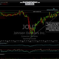 The JOUT long setup triggered an entry back on February 1st on the high-volume break above 22.00 and is getting close to the first target (24.00). My preferred target on the trade at this time is T2 (31.00) however, a reaction (pause or pullback) at or near the T1 level is likely so set your stops and sell limit orders according to your trading plan. At this point, a stop below 21.50 looks ideal. Another potential sell signal would be a weekly close below that bull market uptrend shown on the previous & updated weekly charts below.