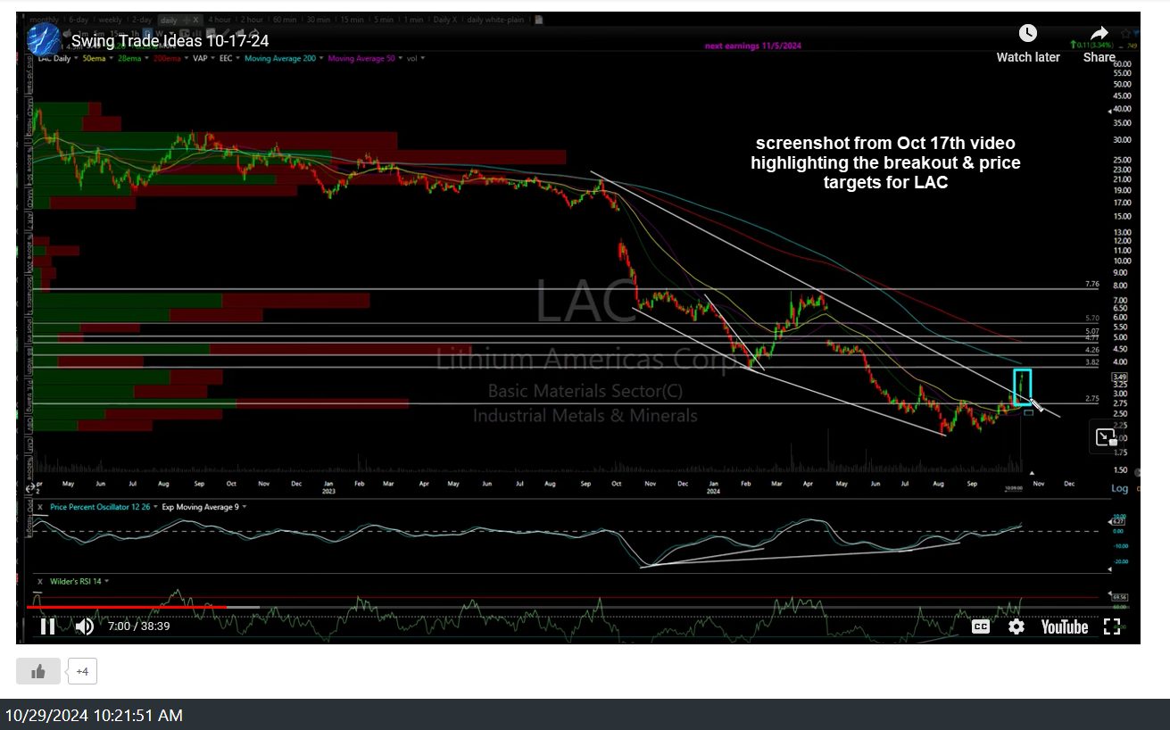 LAC (Lithium Americas Corp) has hit the fourth price target (5.07) for a 45% gain since highlighting the breakout in the Oct 17th video (while trading at 3.49). LIT (lithium ETF) and several individual lithium stocks were also highlighted in yesterday’s video as well. 7.79 remains the max. target although this 5.07 target is the bottom of the huge April 18th gap, where a reaction is likely first. Screenshot from the Oct 17th video highlighting the breakout & price targets followed by the updated daily chart below.