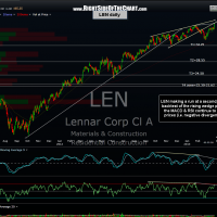 As far as the daily charts, LEN is making a run for a second, higher level backtest of the recently broken rising wedge pattern while also making a new multi-year high today… a mixed bag of bearish and bullish chart action IMO. The new high and current momentum are bullish but on the other hand the MACD and RSI continue to lag significantly on this move to new highs, a clearly bearish development. Putting all that aside, I think it would be best to wait until tomorrow to see if LEN continues to build on these gains, especially after kissing the underside of the wedge once more, or if prices turn back down. Therefore, stops at this point should not be much above the 44.40 level (which is about where a backtest would come in tomorrow). Updated daily & weekly charts: