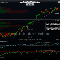 Irrespective of the recent false breakdown and snap-back into the wedge pattern, LL remains one of the better looking longer-term swing short trades. Following the breakdown below the primary uptrend line in LL, Lumber Futures (to which LL stock is highly correlated) made what appears to likely be one final thrust to new highs, in which a nice shooting star topping candlestick was put in and confirmed via prices dropping sharply since. As of today, we also have lumber futures trading down sharply and having broken below what looks like a well defined bearish rising wedge pattern. Only time will tell if this trade plays out and although it is now down about 3 points or 4% from the original entry (64.87), it is still less than half way to the 10%+/- stop out criteria based on my preferred target of 35.10. Updated daily chart of LL as well as an updated daily chart of Lumber futures: