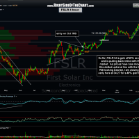FSLR was a recent long (actually, the 2nd of two very successful longs) which I decided to close the trade early for a 48% gain. Luckily, we side-stepped this landmine as the stock has dropped 25% since that very timely exit less than one week ago today. For those more aggressive, nimble traders, FSLR looks like an objective long here at the bottom of this support zone with a stop not too far below. My plan is to shoot for a 2 point bounce and get out quickly. Again, this trade would be for aggressive traders only as FSLR is in virtual free-fall. The first chart is the previous 4 hour chart posted with the exit of the previous long, followed by the updated 4 hour chart. Current price/entry is 25.54, bounce target 27.55, with a stop under 25.00. This gives the trade approximately a 4:1 R/R.