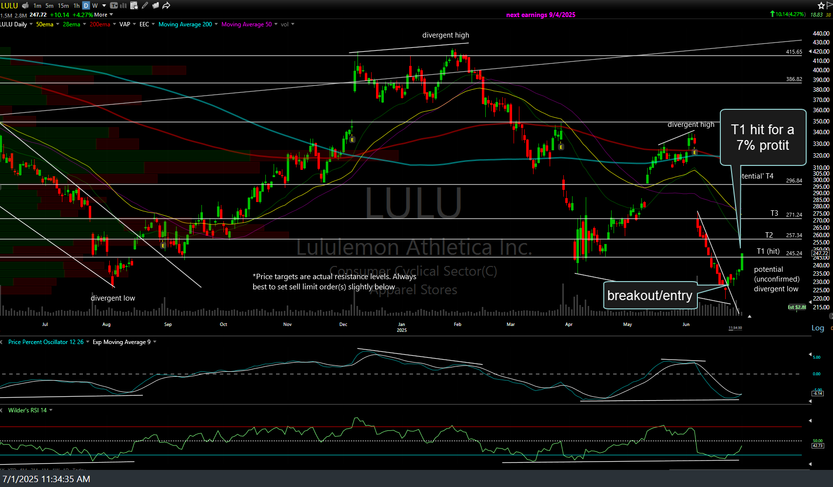 LULU Lululeon 1st Price Target Hit 7-1-25