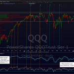 one other thing to note: you might recall is post i made a few weeks ago as the QQQ/NDX was approaching the 80 level on the RSI (14), which is an extreme overbought reading that is not often reached. well, we of course since went above that level since that post and as i had noted, the RSI readings can and often has remained in overbought territory (a reading of 70 or higher is considered overbought on the RSI) for a few days/weeks before dropping back below the 70 level when the ensuing sell-off began. if you take a look at the QQQ daily chart below, you will see that we will most likely get a cross back below the 70 level if the market closes in the red today, giving us another sell signal.