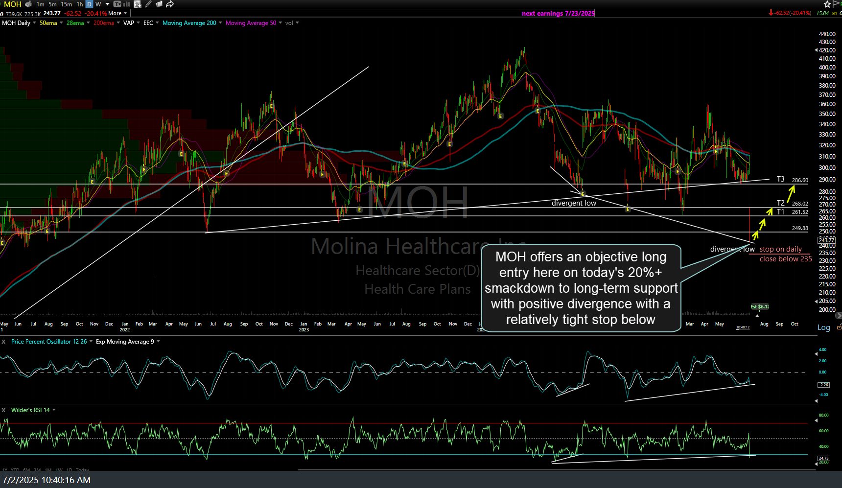 MOH (Molina Healthcare Inc.) offers an objective long entry here on today’s 20%+ smackdown to long-term support with positive divergence with a relatively tight stop below. Weekly & daily chart (with price targets & suggested stop) below.