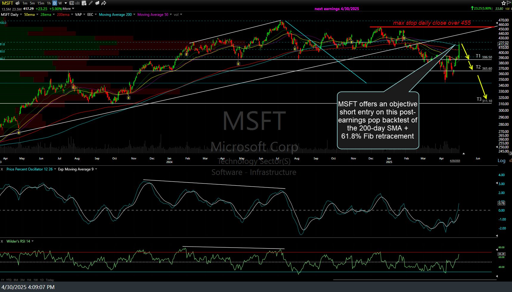 MSFT (Microsoft Corp) offers an objective short entry on this post-earnings pop backtest of the 200-day SMA + 61.8% Fib retracement of the initial drop off the July 5, 2024 ATH down to the April 7th lows. Max. suggested stop (if targeting T3) on a daily close over 455. Daily chart below includes today’s after-hours trades in the most recent candlestick.