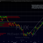 i am still short MUX (changed symbol from UXG last week) and made some notes on the charts. i’m favoring a bounce in the $USD and a pullback in GLD beginning sometime this week and if that happens, this very overbought gold stock should have some correcting to do on the downside. will update some targets soon assuming prices don’t move up much past last weeks highs (my stop). 60 min and daily charts below. to reference prior posts, use “UXG” in the search field.