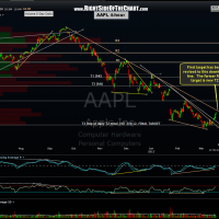 For those in the AAPL long trade, please note that the first target has been revised to a lower lever. The new first target (T1) will be the primary downtrend line shown on this updated 4-hour chart. The original first target (482.50) has been changed to T2. That trendline is also the top of the descending channel shown on the recently posted daily charts (and the updated daily chart below as well). Currently, if prices were to hit that trendline in the next day or so, it would come in around the 460 area, above 5 points above current levels.