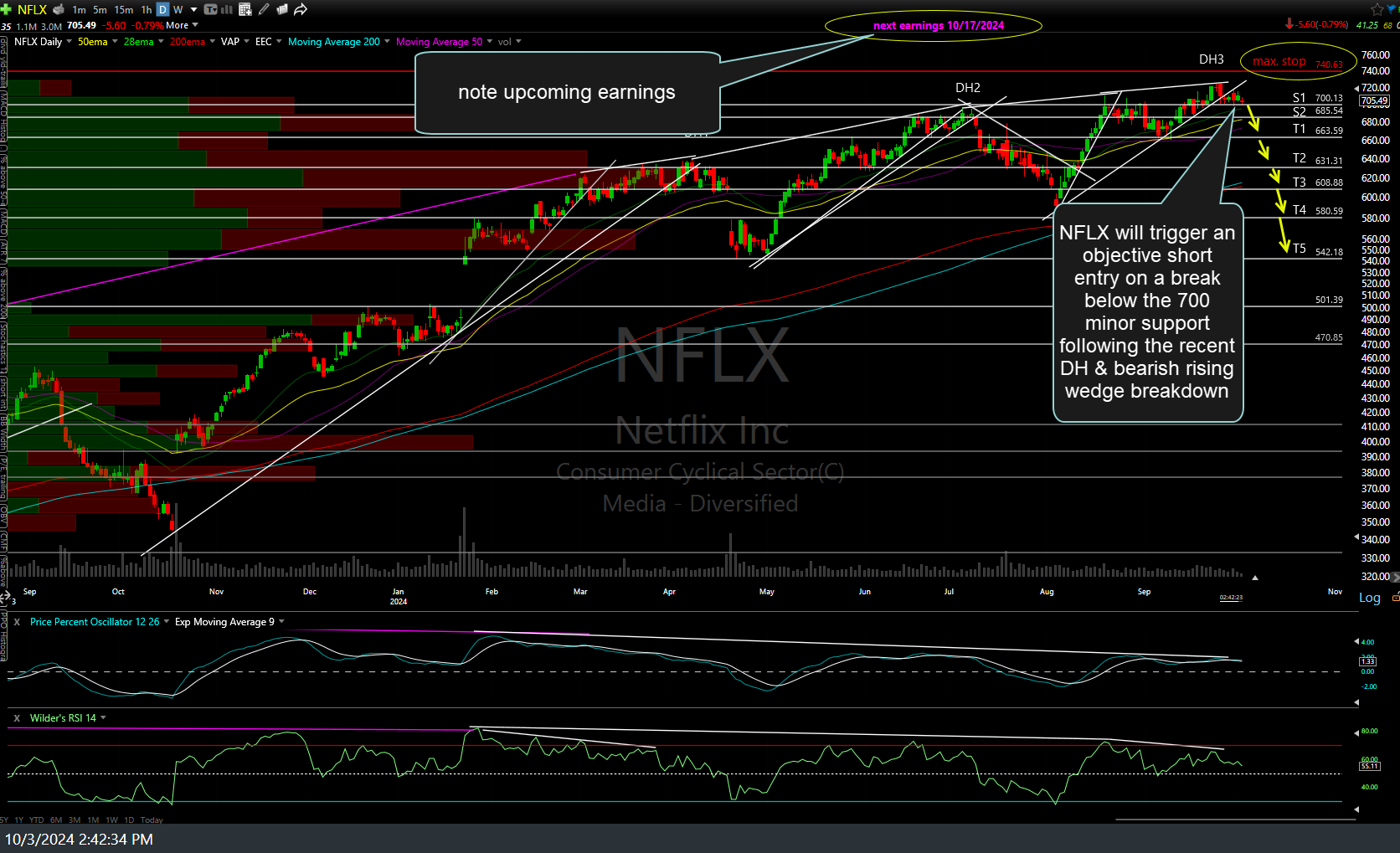 NFLX (Netflix Inc.) will trigger an objective short entry on a break below the 700 minor support following the recent divergent high & bearish rising wedge breakdown on the daily chart below.