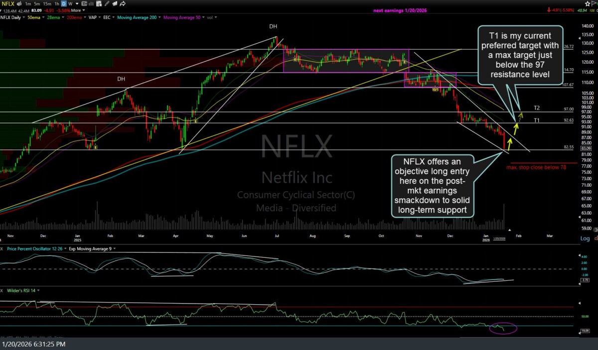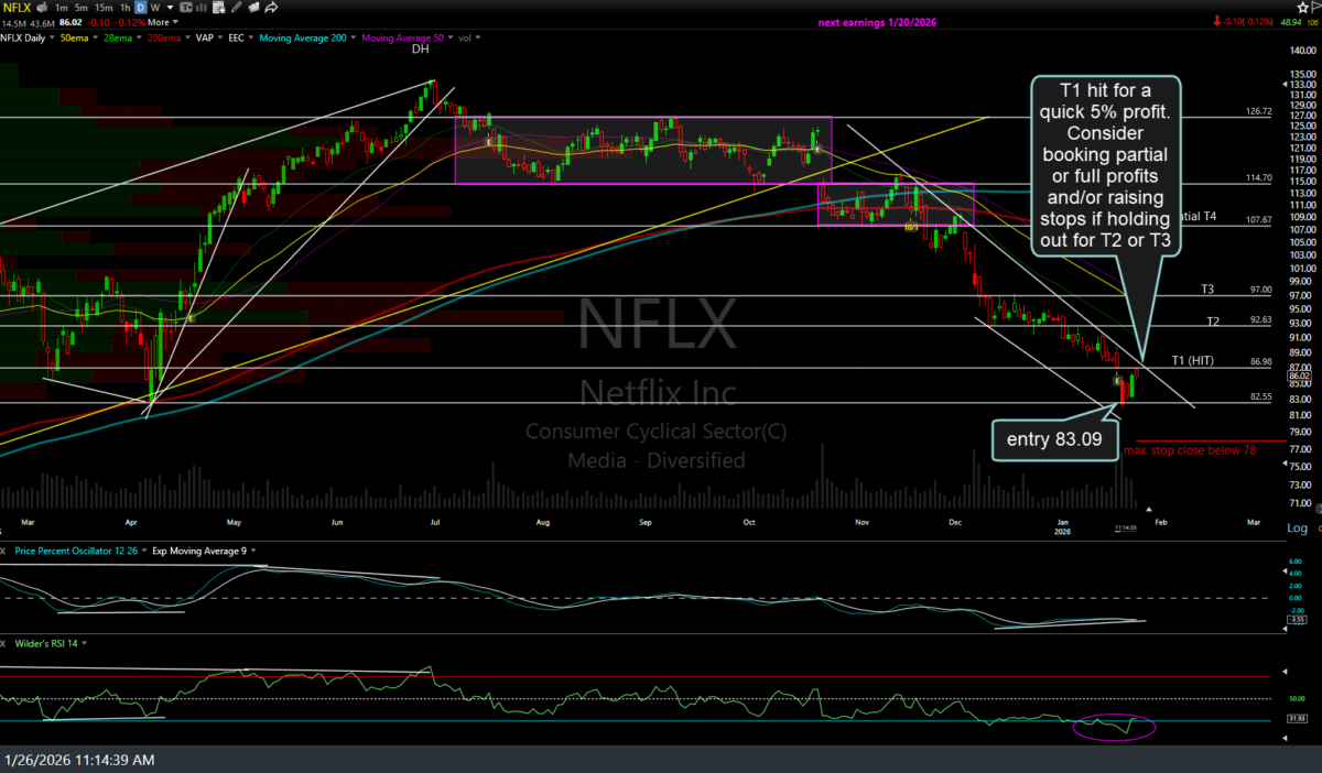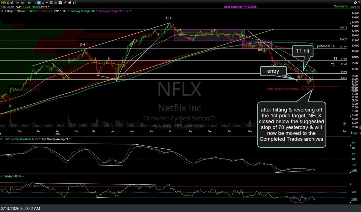 After hitting & reversing off the 1st price target, NFLX (Netflix Inc) closed below the suggested stop of 78 yesterday & will now be moved to the Completed Trades archives. Previous & updated daily charts below.