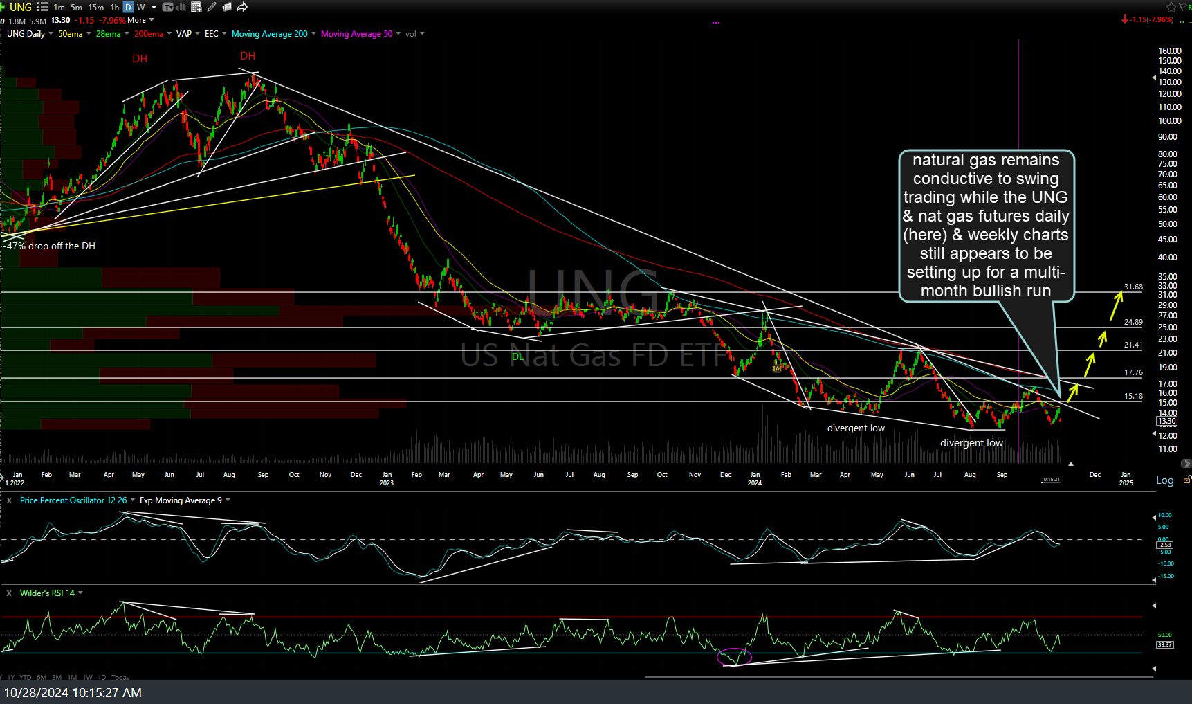 Natural gas remains conductive to swing trading on the 60 & 120-minute time frames while the UNG & natural gas futures daily (here) & weekly charts still appears to be setting up for a multi-month bullish run.