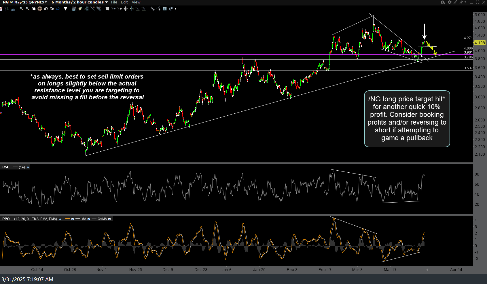 The /NG (natural gas futures) long price target has just been hit* for another quick 10% profit. Consider booking profits and/or reversing to short if attempting to game a pullback. Previous & updated 120-minute charts below.