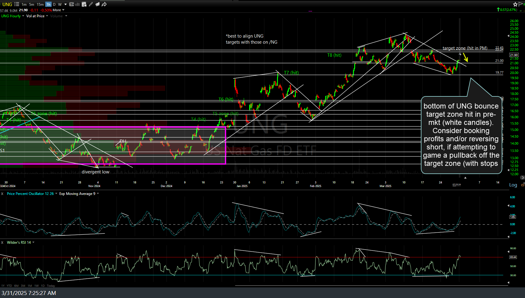 Likewise, the UNG (natural gas ETF) has also just hit the bottom of its comparable bounce target zone in the pre-market session (white candles). Consider booking profits and/or reversing short, if attempting to game a pullback off the target zone (with stops somewhat above it). Previous & updated 60-minute charts below.