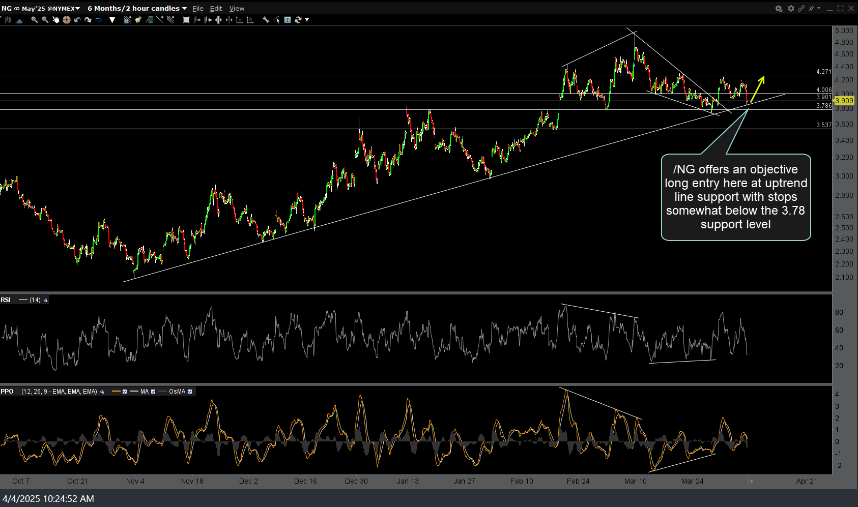 /NG (natural gas futures) offers an objective long entry here at uptrend line support with stops somewhat below the 3.78 support level. 120-minute chart below.