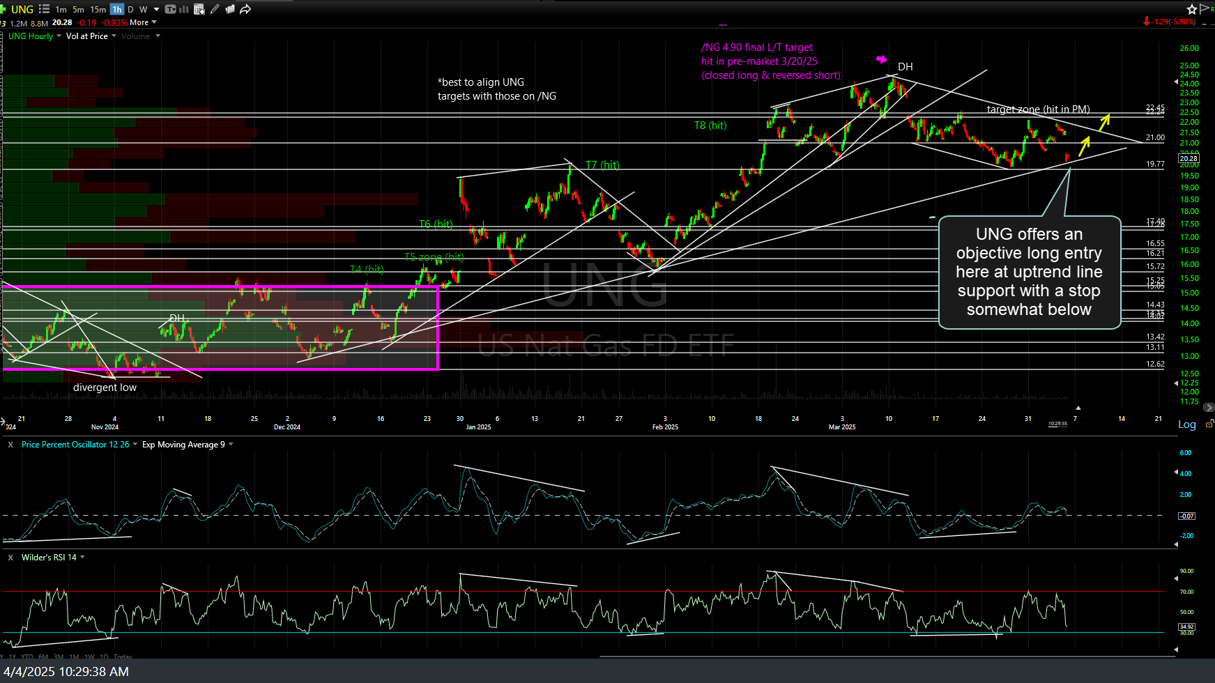 Alternatively, UNG (natural gas ETF) also offers an objective long entry here at uptrend line support with a stop somewhat below. 60-minute chart below.