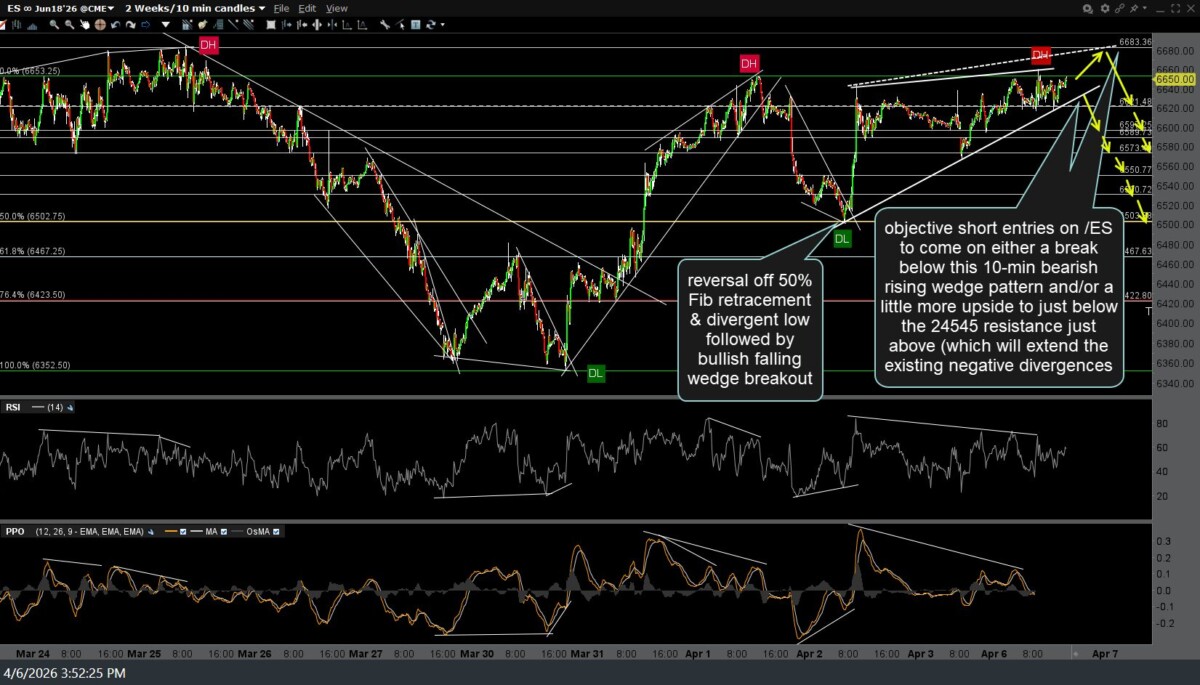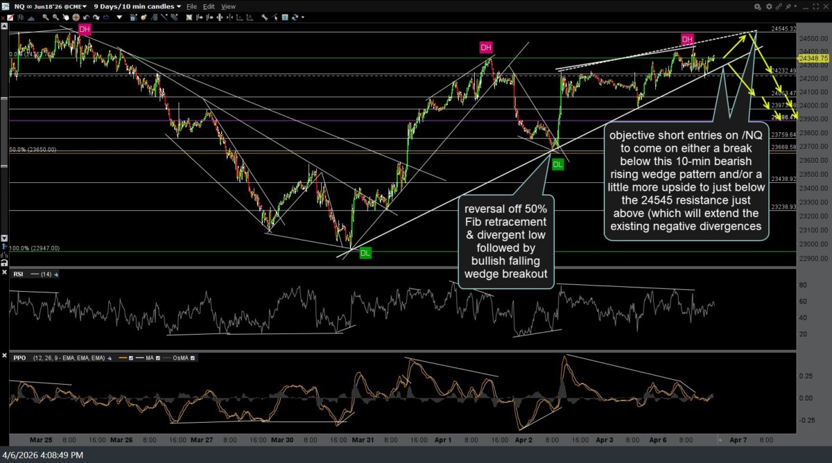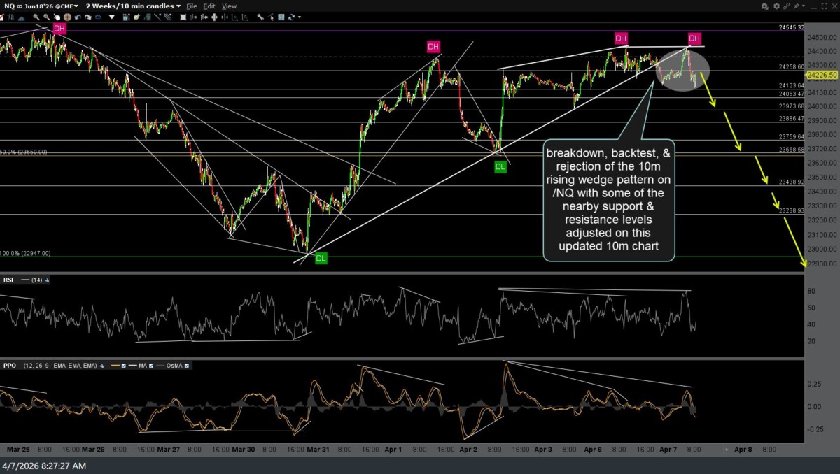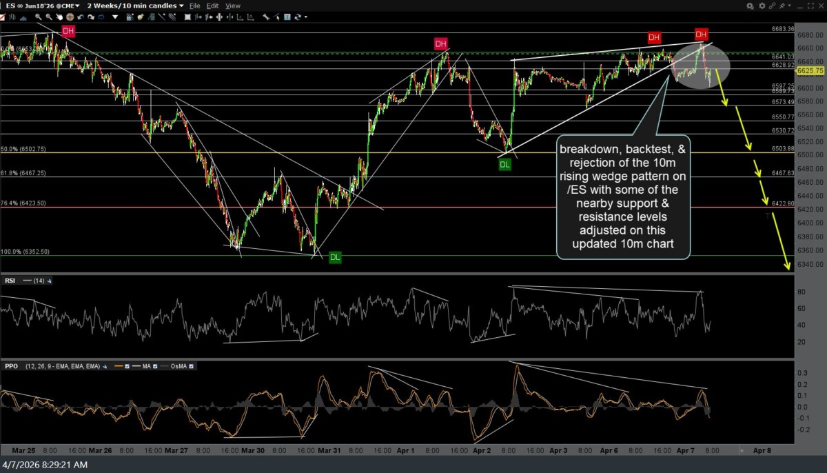 /NQ (Nasdaq 100 futures) & /ES (S&P 500 futures) both went on to breakdown, backtest, & followed by a rejection of the 10-minute rising wedge patterns posted late yesterday. Those previous (yesterday’s) charts, followed by the updated 10-minute charts, along with a couple of adjustments to some of the nearby support & resistance levels.