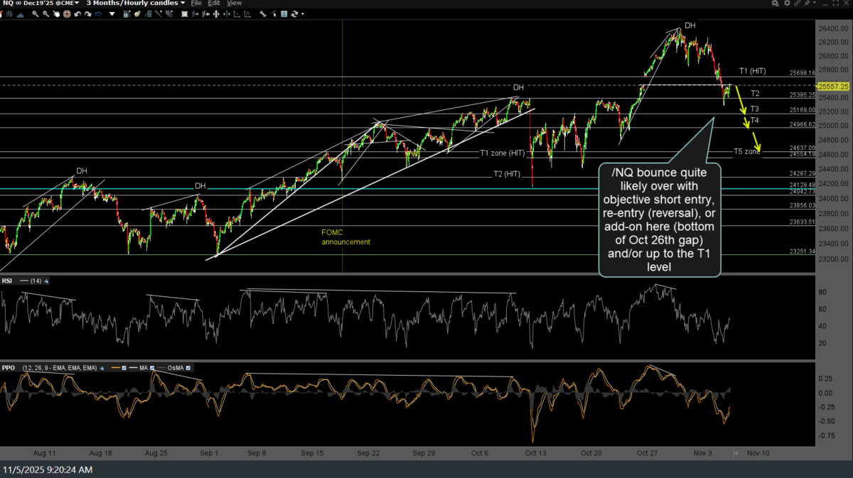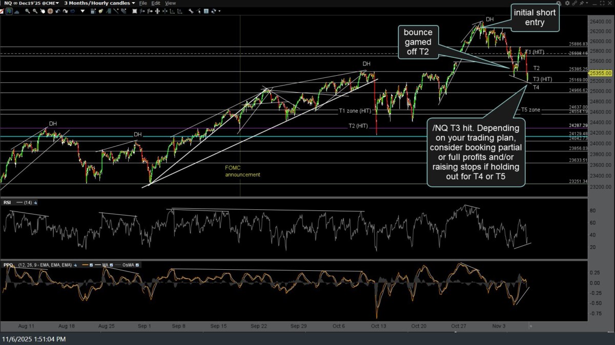 /NQ (Nasdaq 100 futures) short-term swing trade has just hit the third price target (T3), with QQQ still holding around it’s second price target (15-minute chart) with the reaction off that level more so in time vs. price, so far. Depending on your trading plan, consider booking partial or full profits and/or raising stops if holding out for T4 or T5. Initial (Oct 29th), previous (yesterday’s) & updated 60-minute charts below.