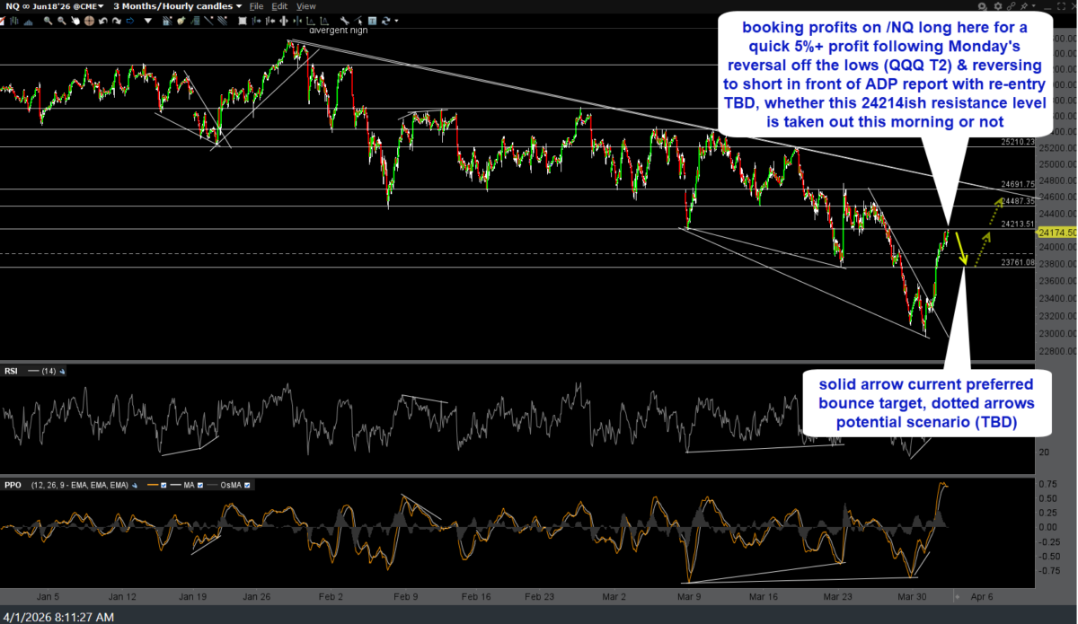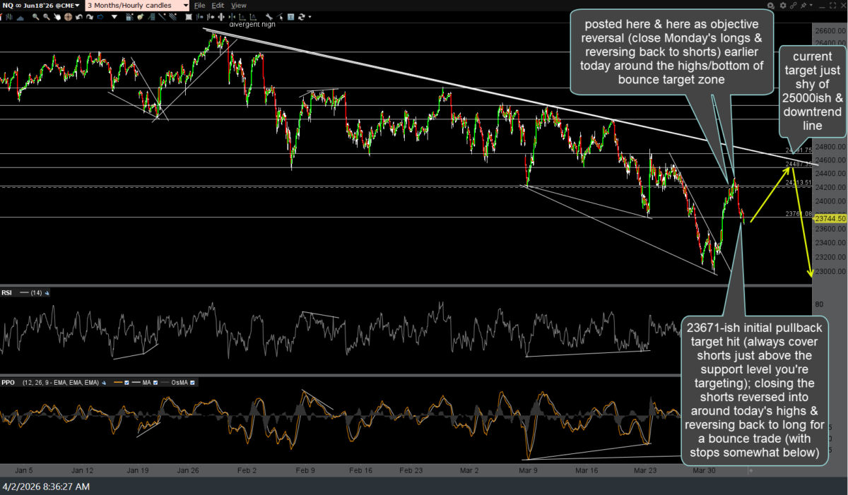 The 23671-ish initial pullback target on /NQ (Nasdaq 100 futures) posted yesterday when I started booking profits on the longs reversed into (from short) off Monday’s lows with QQQ hitting the bottom of my bounce target zone (and /NQ at price resistance as well) has been hit for a quick 2%+ profit. I’m closing those shorts reversed into around yesterday’s highs & reversing back to long for a bounce trade, with staggered stops somewhat below. Previous (Wednesday) & updated 60-minute chart, including my current bounce target, below.