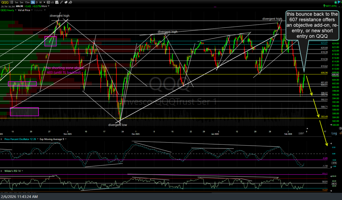 This bounce back to the 607 resistance offers an objective add-on, re-entry, or new short entry on QQQ (or /NQ futures) as well as a quick day trade pullback opp. 60-minute chart below.
