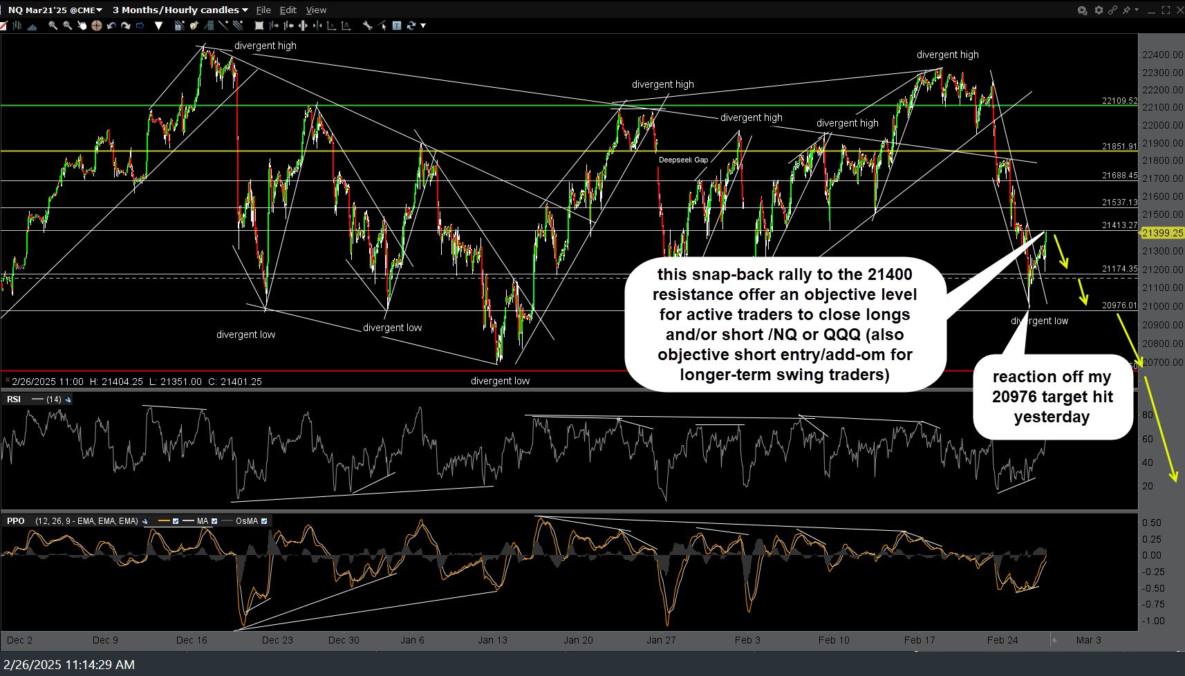 Following yesterday’s hit & reversal off my 20976 price target on /NQ, this snap-back rally to the 21400 resistance level offers an objective level for active traders to close longs and/or short /NQ or QQQ (also objective short entry/add-on for longer-term swing traders). Previously posted static chart (many more update in recent videos) from last Thursday, followed by my updated 60-minute chart below.
