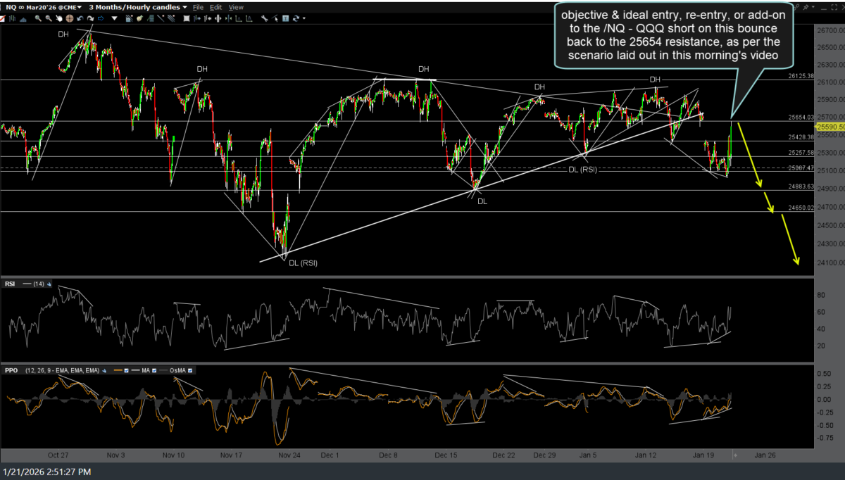 Likewise, /NQ (Nasdaq 100 futures) also offers an objective & ideal entry, re-entry, or add-on to the current short trade on this bounce back to the 25654 resistance, as per the scenario laid out in this morning’s video. 60-minute chart below.
