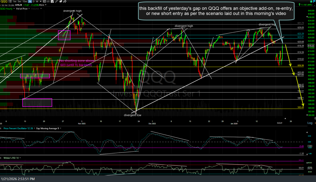 This backfill of yesterday’s gap on QQQ offers an objective add-on, re-entry, or new short entry as per the scenario laid out in this morning’s video. 60-minute chart below.