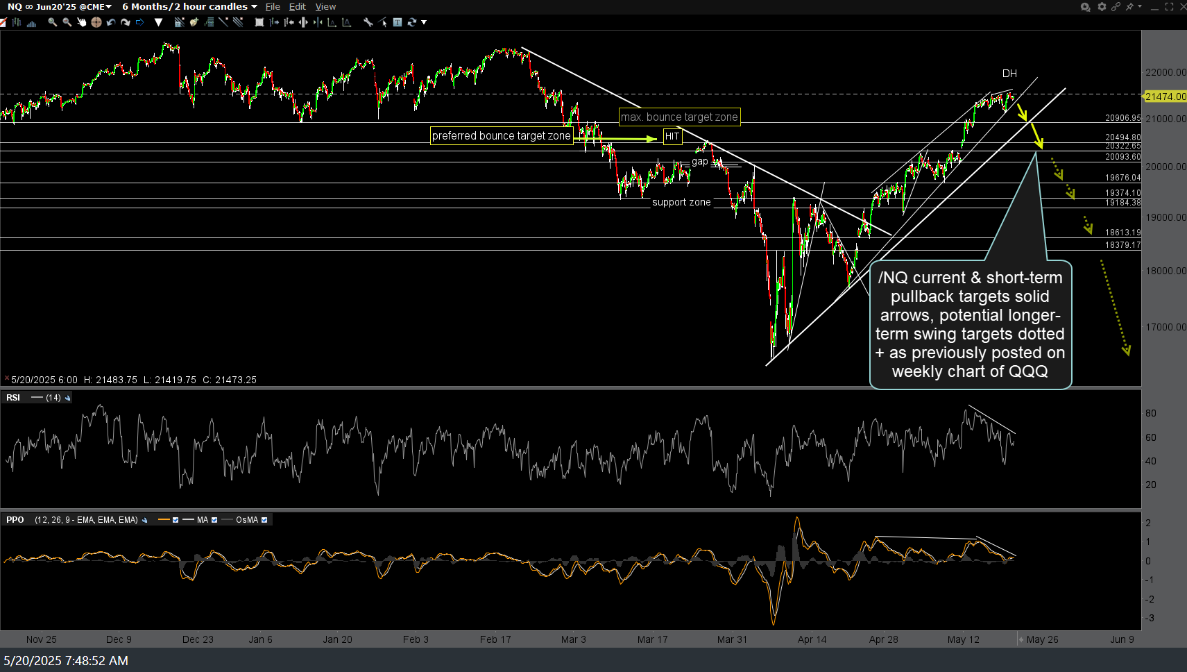 60-minute chart of /NQ (Nasdaq 100 futures) with current & short-term support levels & pullback targets shown with solid arrows, potential longer-term swing targets dotted + as previously posted on weekly chart of QQQ. As with QQQ, one could take an aggressive short here in anticipation of a breakdown below that upper-most minor uptrend line (my preference) and/or wait for the more conventional entry on a breakdown below it before initiating a position or adding to a starter position taken here.
