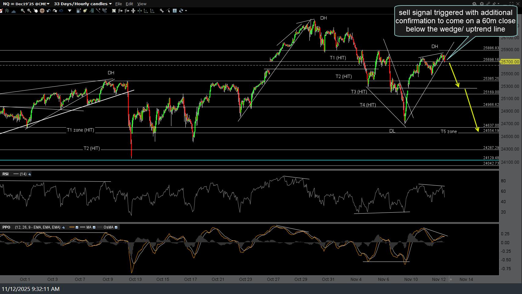 Keep in mind that the bulk of the price targets on these intraday charts of /NQ & QQQ have now been hit. As such, most of the meat on this “short-term” swing trade has now been sheared off the bone & it is no longer (IMO) objective to initiate a new short entry to try and milk that last little bit down. Even those already short might opt to either sit tight with stops in place (which should have been lowered since the initial entry and/or any of the bounce re-entries, such as earlier this week), if holding out for the next & final near-term targets on this short-term swing trade… depending on your trading plan, of course.