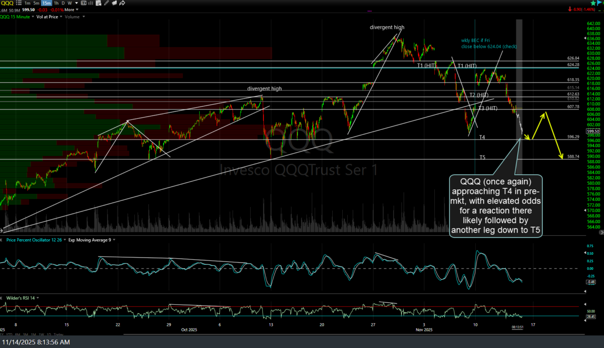 Likewise, QQQ is (once again) approaching T4 in the pre-market trading session, with elevated odds for a reaction there likely followed by another leg down to T5.