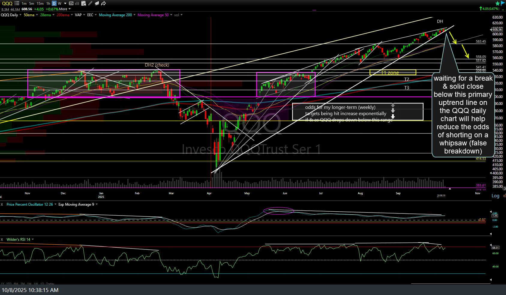 Should /NQ hit the 4th & final target on this short-term, 15-minute chart, that would sharply increase the odds that T2 on the recent swing trade based off the daily chart of QQQ will be hit as well. Previous (Oct 8th & Nov 1oth) & updated daily charts of QQQ below.