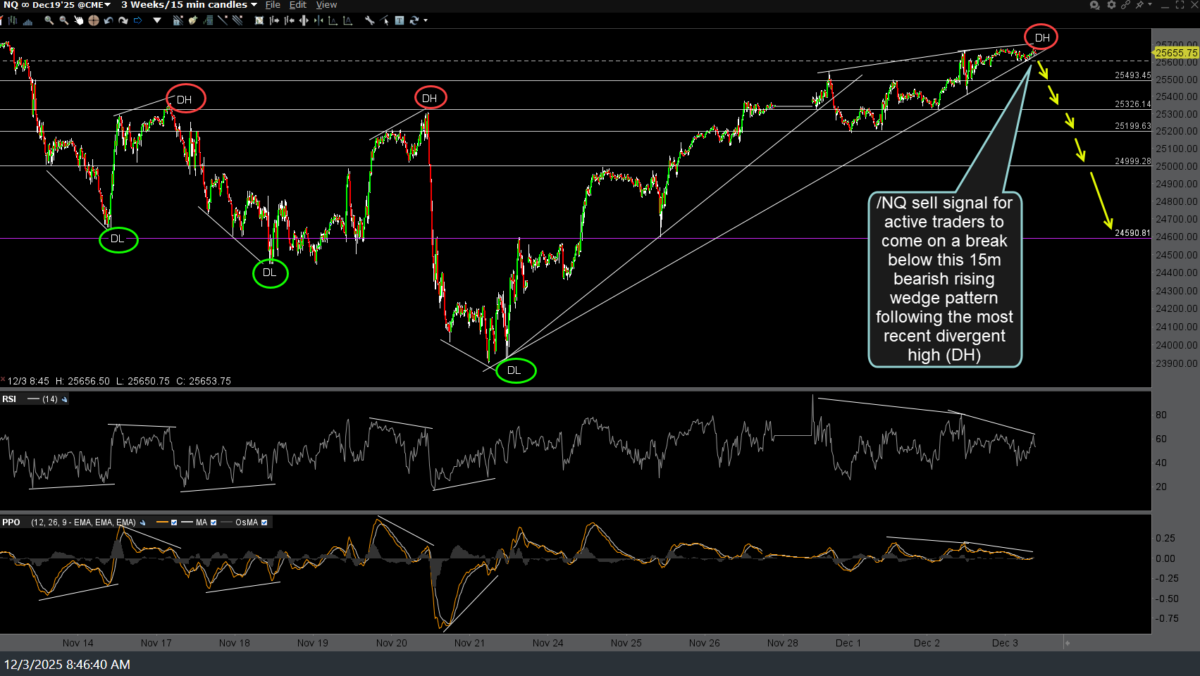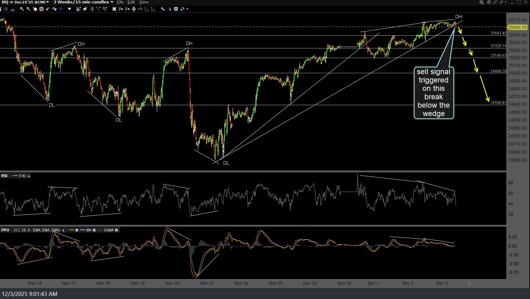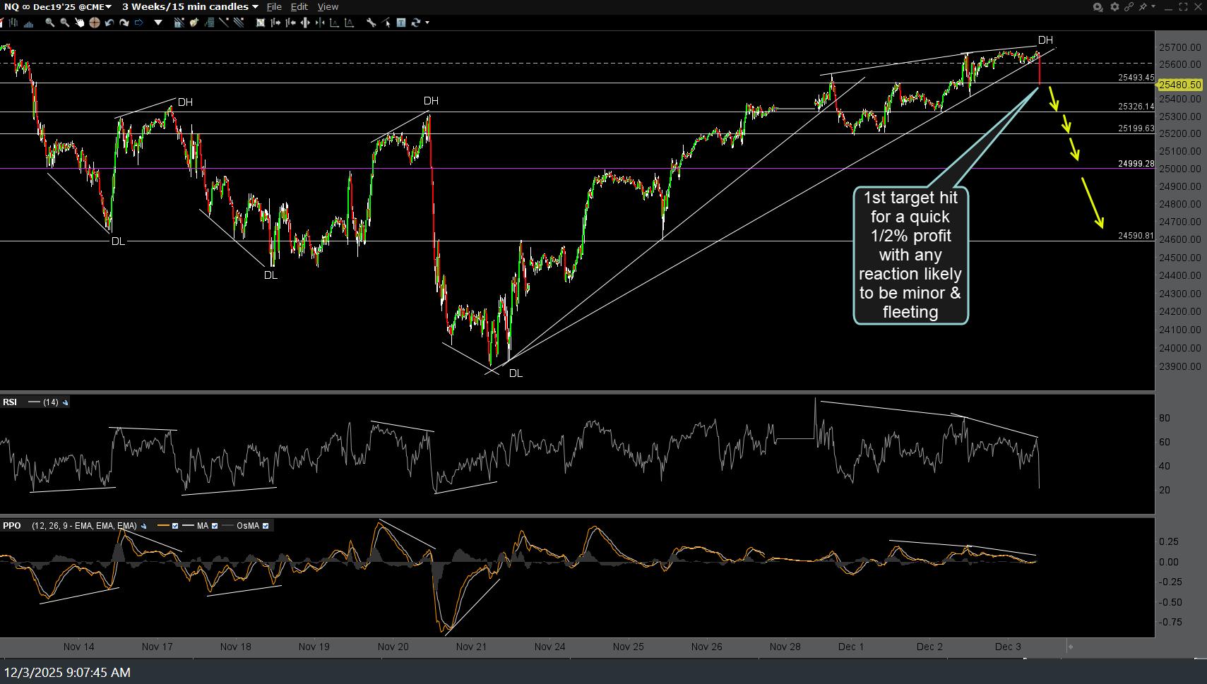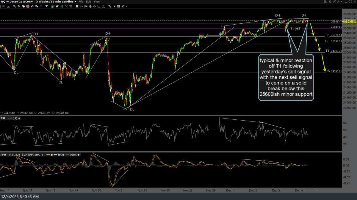 So far, we had the typical & minor reaction off the first price target on the 15-minute chart following yesterday’s sell signal on the trendline break, with the next sell signal to come on a solid break below this 25,600ish minor support. Updated (first) followed by the previous 5-minute charts from yesterday, below.