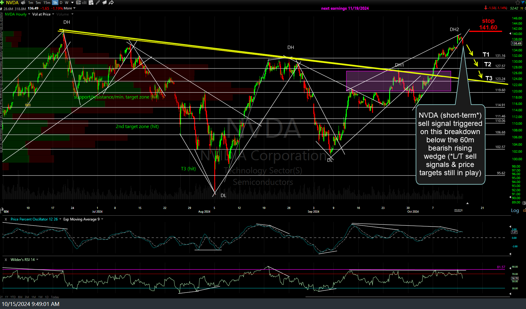 NVDA ( NVIDIA Corp) has triggered a short-term* sell signal as per yesterday’s video on this breakdown below the 60-minute bearish rising wedge (*the long-term sell signals & price targets still in play). Price targets & suggested stop for the short-term swing trade shown on the 60-minute chart below.
