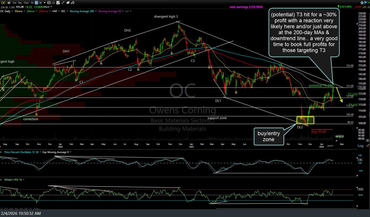 The recent OC (Owens Corning) long trade just hit that (potential) third & final target (T3) I added when the stock hit T2 a few weeks ago, for a ~30% profit with a reaction very likely here and/or just above at the 200-day MAs & downtrend line.. a very good time to book full profits for those targeting T3. I recall someone asking my thoughts about the likelihood of OC continuing up to this third target in one of the comment sections so I figured that I’d post the update with an email notification (as a home page post). Previous (Jan 9th) & updated daily chart below.