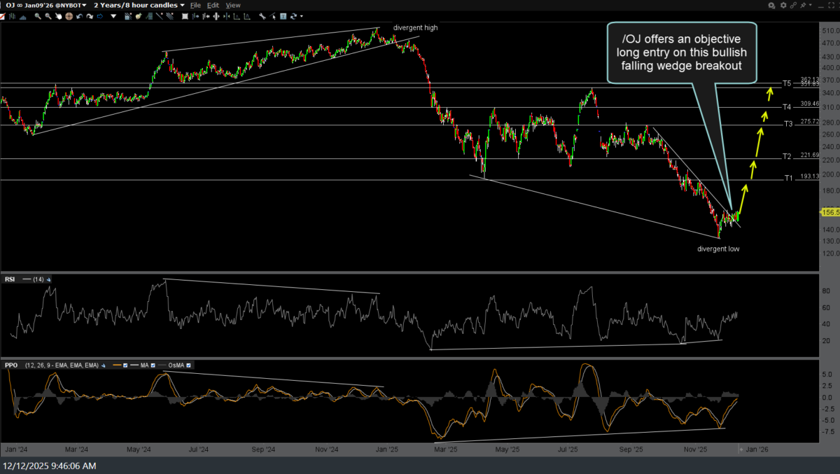 /OJ (orange juice futures) offers an objective long entry on this bullish falling wedge breakout with stops commensurate with one’s preferred price target(s), which are labeled on the 8-hour (candlestick), 2-year chart below. To the best of my knowledge, there aren’t any ETFs or ETNs that directly track OJ futures.